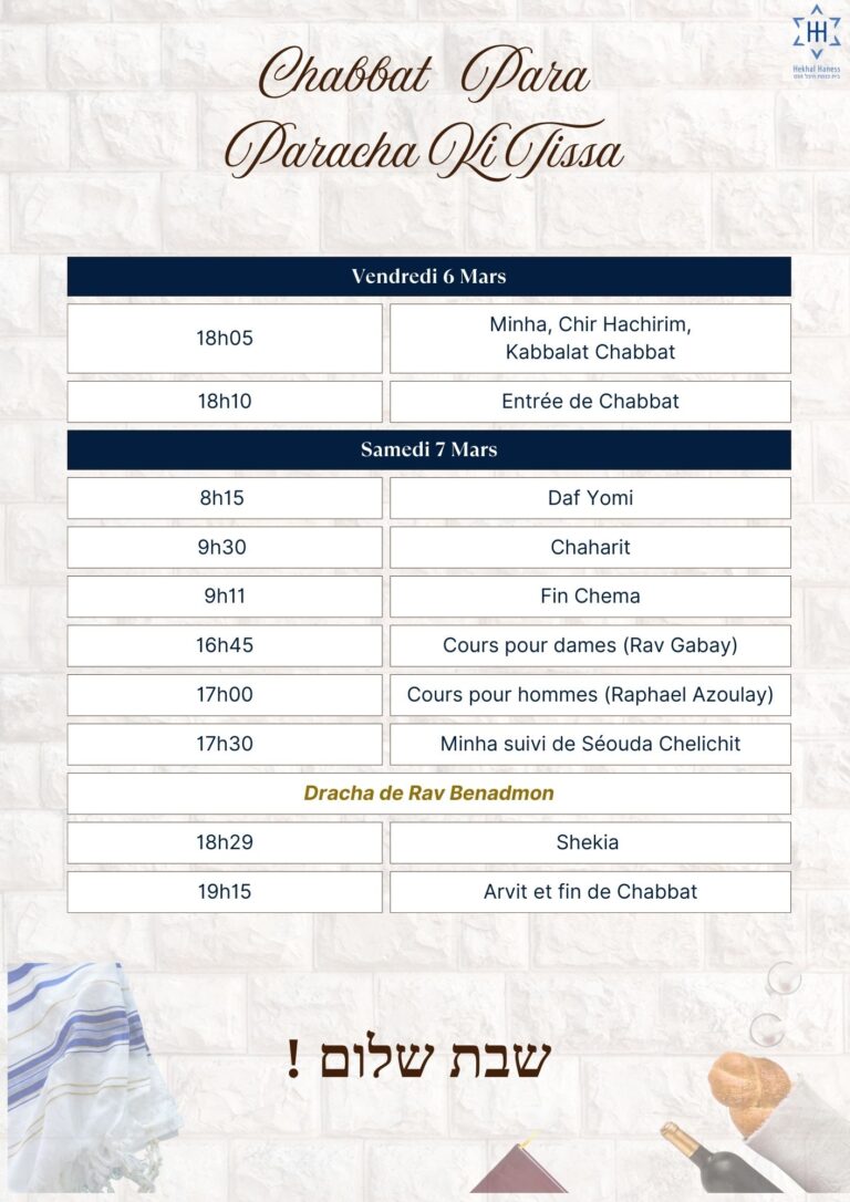 Cha'harit 8h00Min’ha suivi de Arvit 18h15
